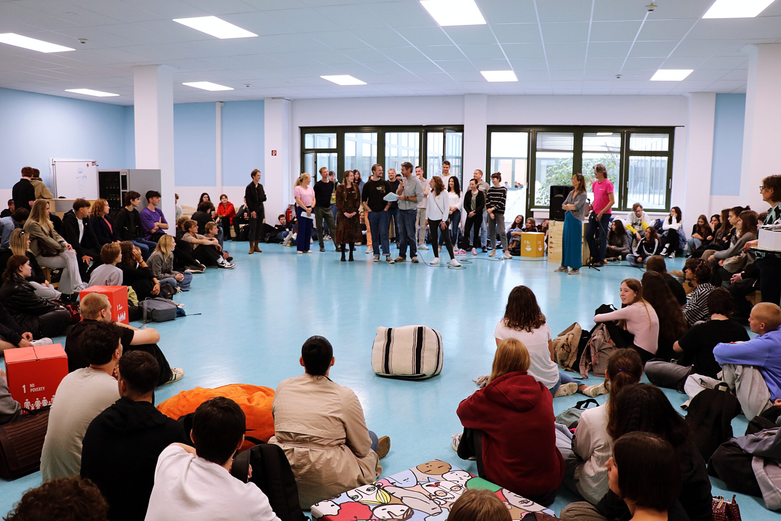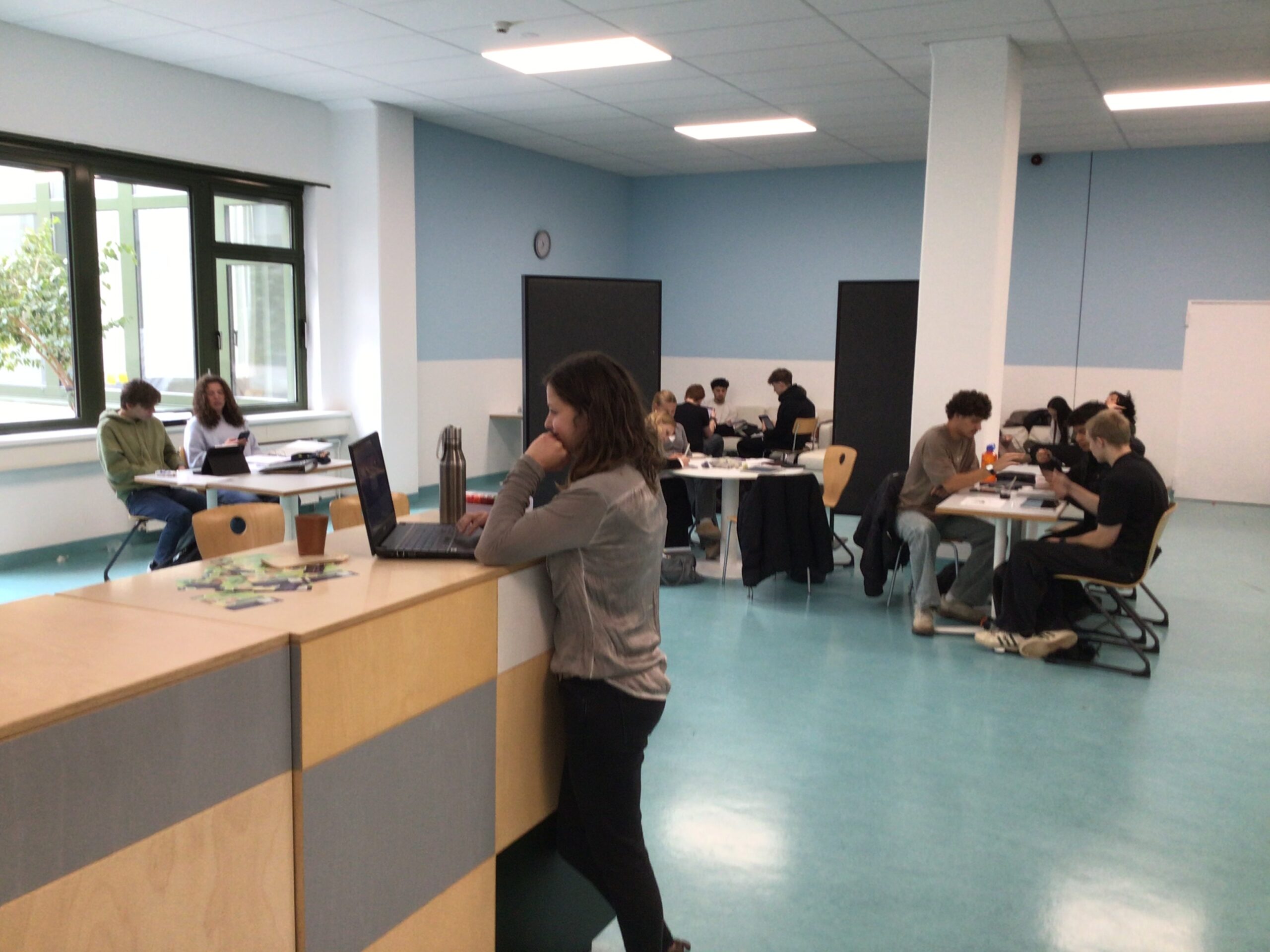 Die Vorbereitungsstufe besteht aus den Vorklassen und den 11. Klassen. Das Herzstück ist der Co-Working-Space in der Mitte der gesamten Etage. Während der Lernzeit verlassen die Schüler*innen ihre Impulsräume und lernen hier selbstständig, wobei sie von den Lehrer*innen begleitet werden.